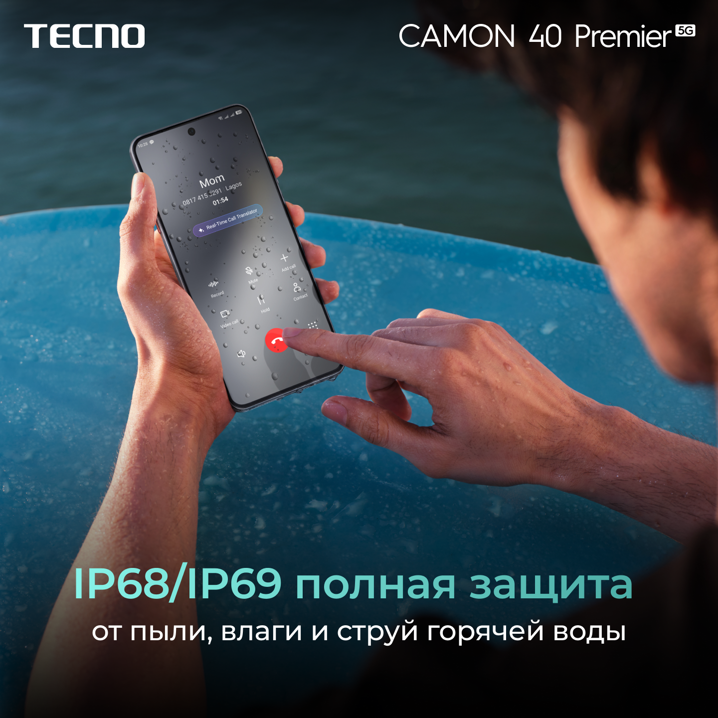 Корпус TECNO Camon 40 Premier 5G полностью защищён от пыли, влаги и даже сильных струй горячей воды по стандарту IP68/IP69.